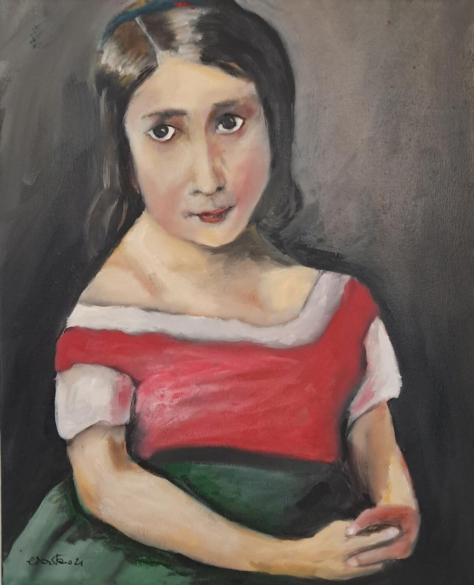 In questo ritratto a olio su tela, l’intensità emotiva di un’infanzia sospesa tra realtà e immaginazione si fa carne e colore. Attraverso una gestualità espressionista e una tavolozza vibrante, la figura della bambina emerge con uno sguardo profondo e misterioso, capace di condensare in sé l’innocenza, la malinconia e una saggezza che sembra trascendere gli anni.