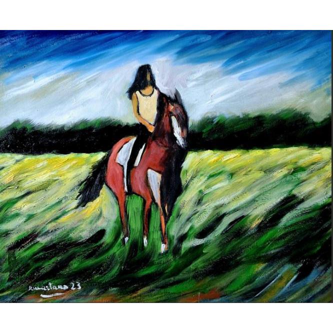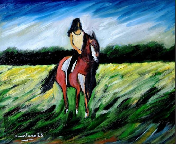 In questa tela, il paesaggio rurale si trasforma in un inno dinamico all'indipendenza e alla forza vitale. La figura della ragazza a cavallo, colta nel pieno di un galoppo liberatorio, non è una semplice rappresentazione, ma il simbolo di un legame ancestrale tra essere umano e natura: un istante assoluto in cui cavallo e cavaliere si fondono in un’unica presenza in movimento.